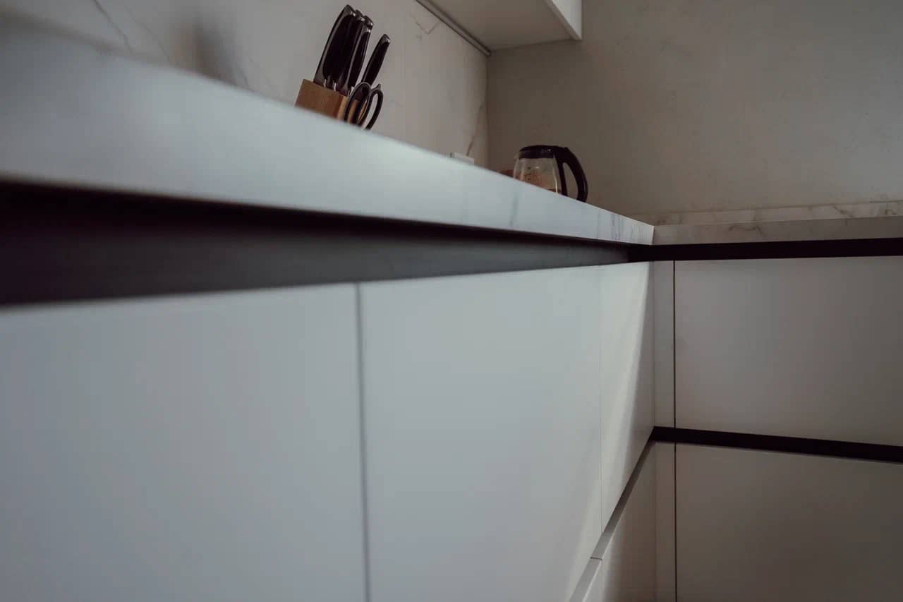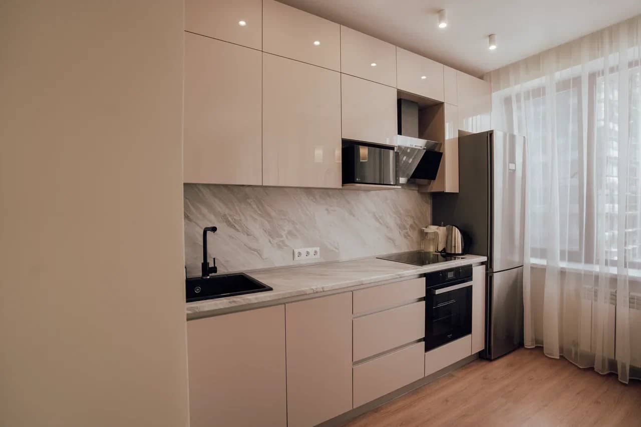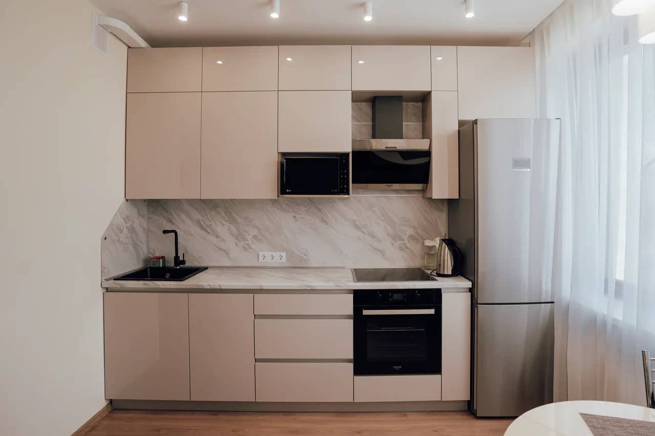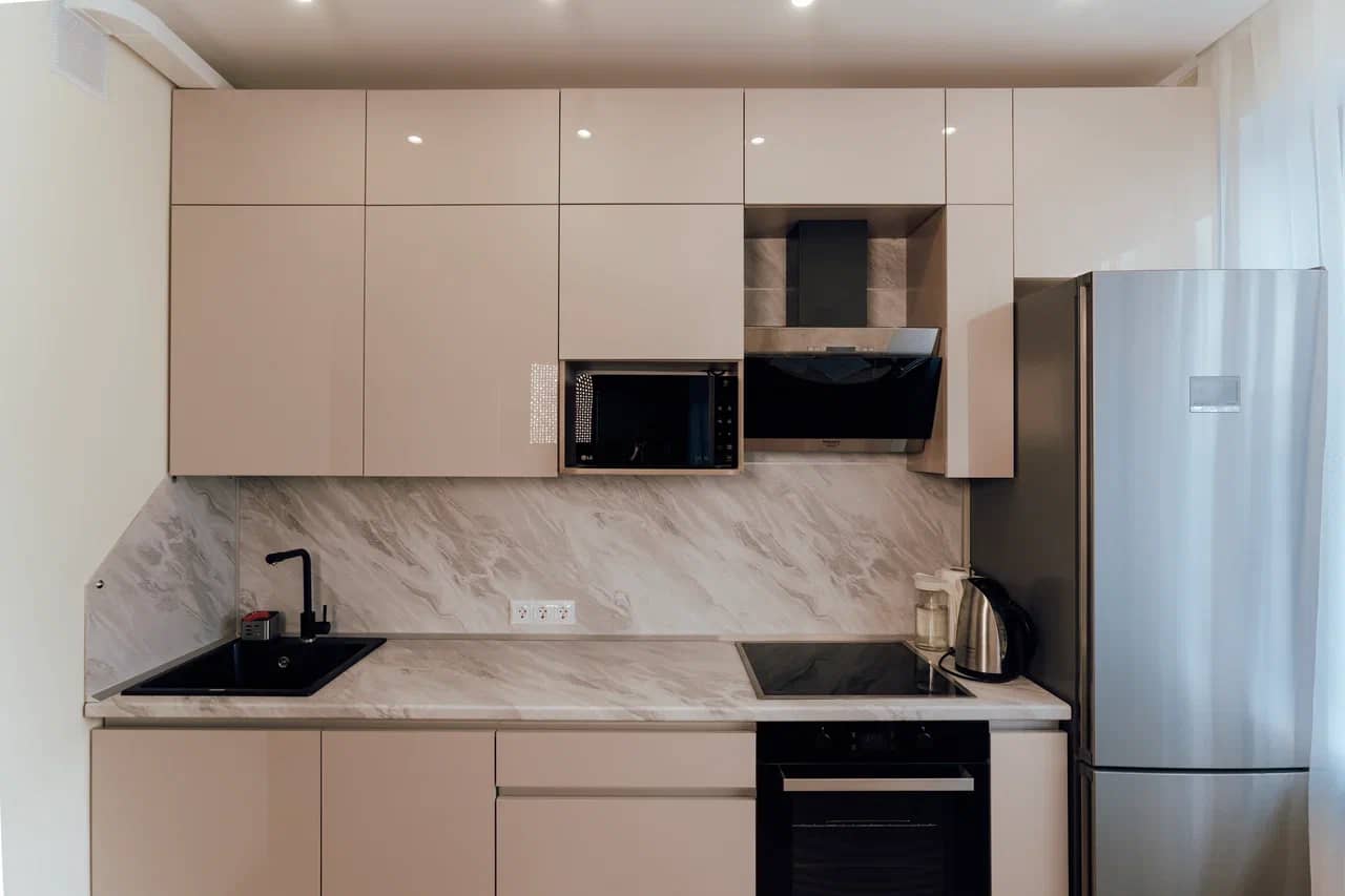 Удобная высота столешницы для готовки. Шкафчики на оптимальном расстоянии, чтобы вам удодно было дотянуться.