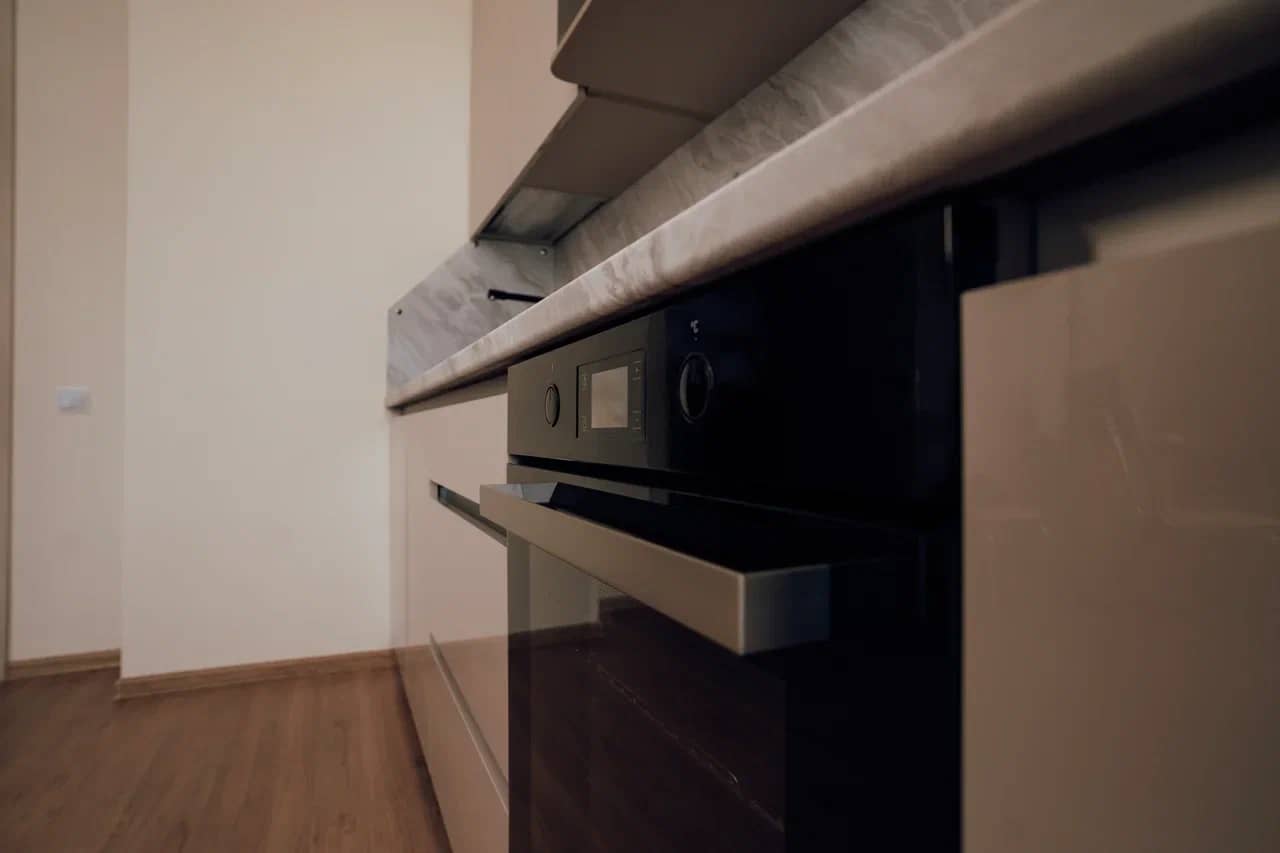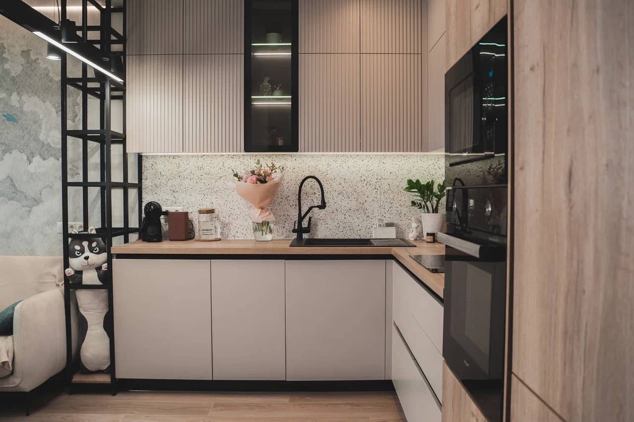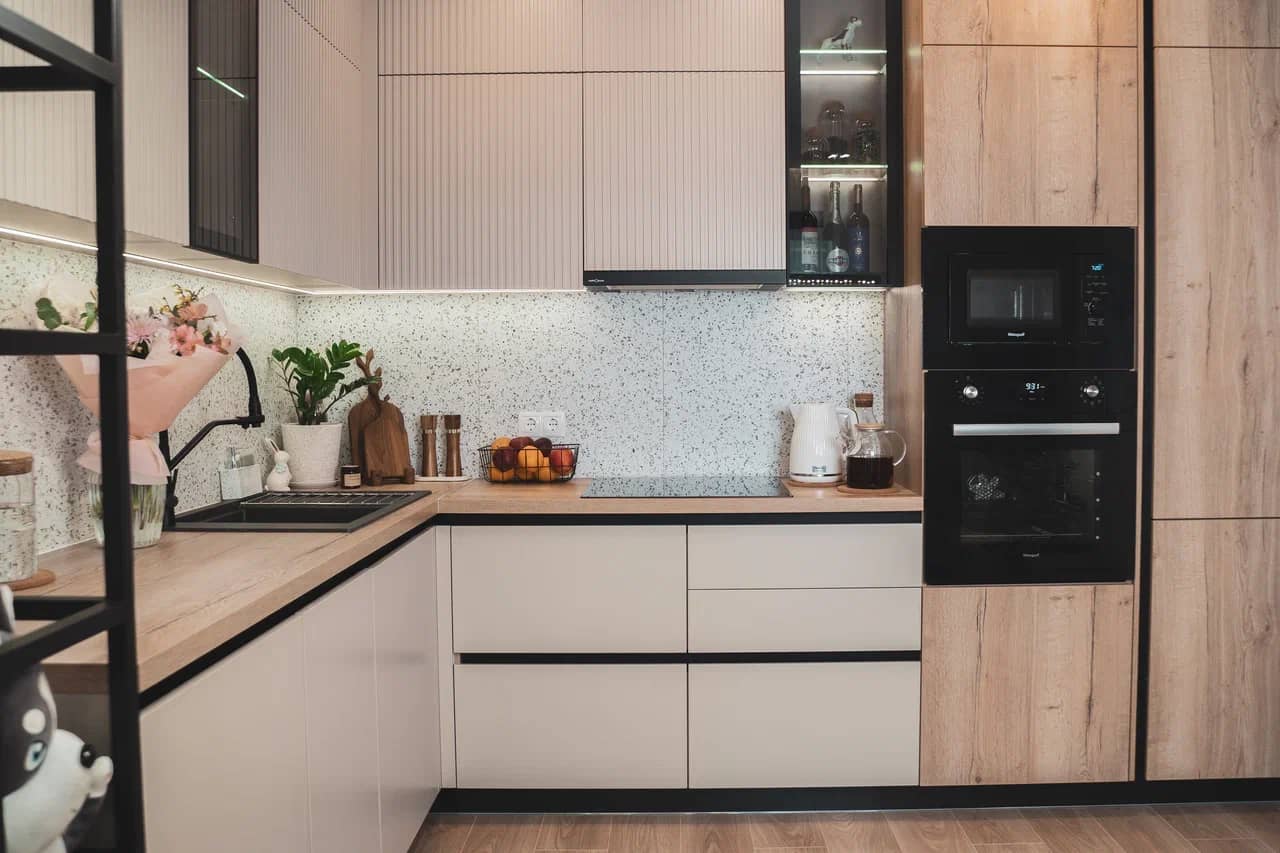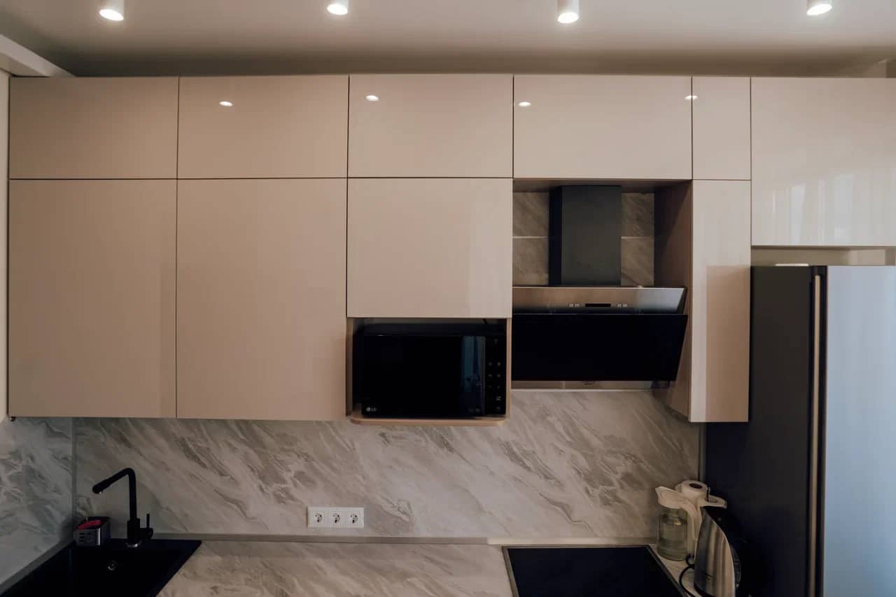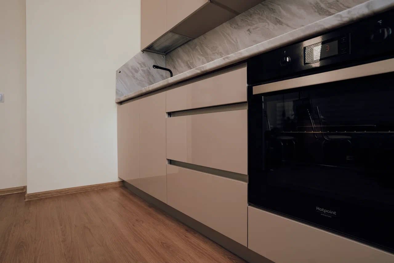 Удобная высота столешницы для готовки. Шкафчики на оптимальном расстоянии, чтобы вам удодно было дотянуться.