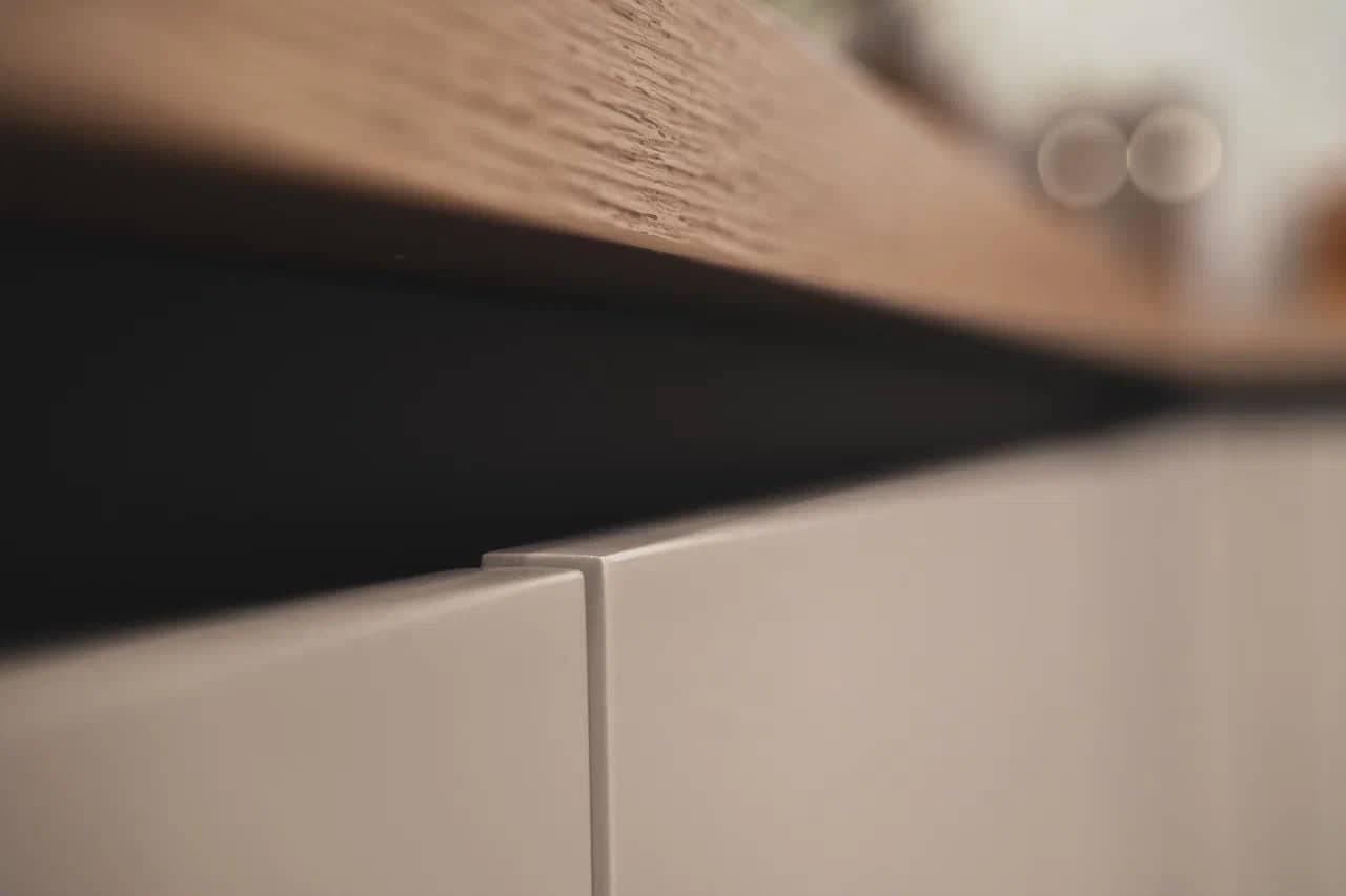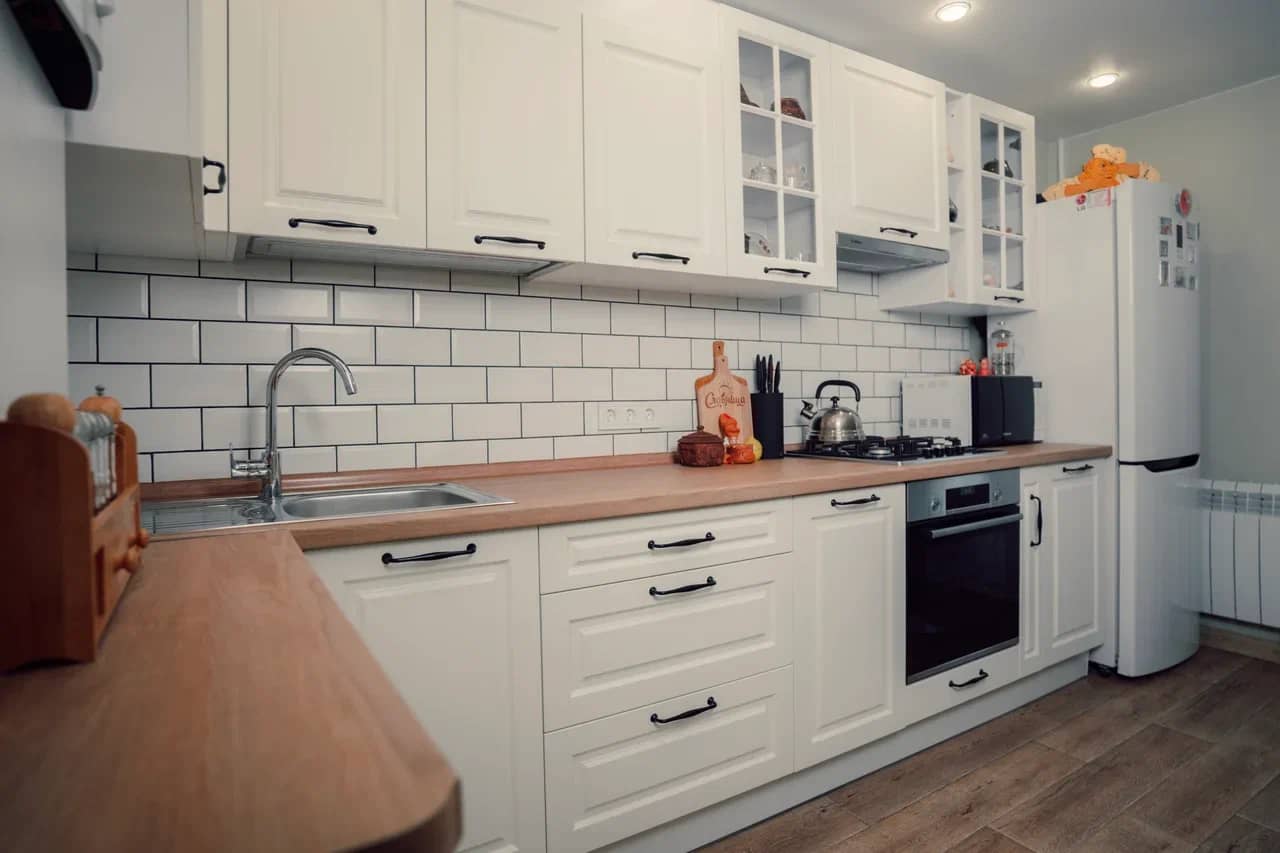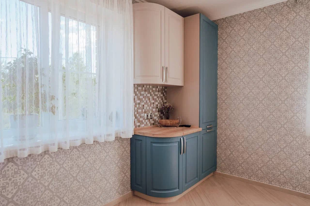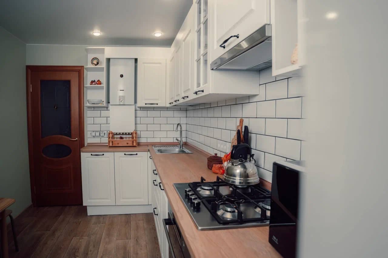 Удобная высота столешницы для готовки. Шкафчики на оптимальном расстоянии, чтобы вам удодно было дотянуться.