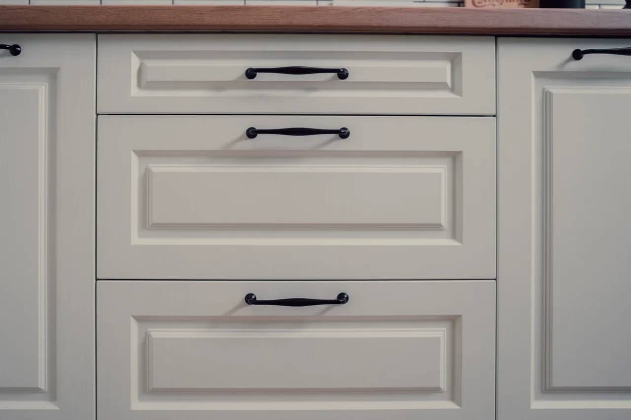 Если у Вас угловая кухня, то на угловых модулях нужно сделать фальши минимум 4 см, чтобы ручки не бились при открывании. То же самое, если фасад открываться к стене. Еще ручки должны подходить по стилю, за них должно быть удобно браться.